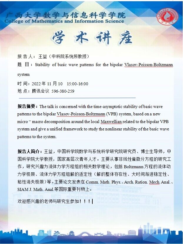 学术讲座:Stability of basic wave pattems for the bipolar Vlasov-Poisson-Boltzmann