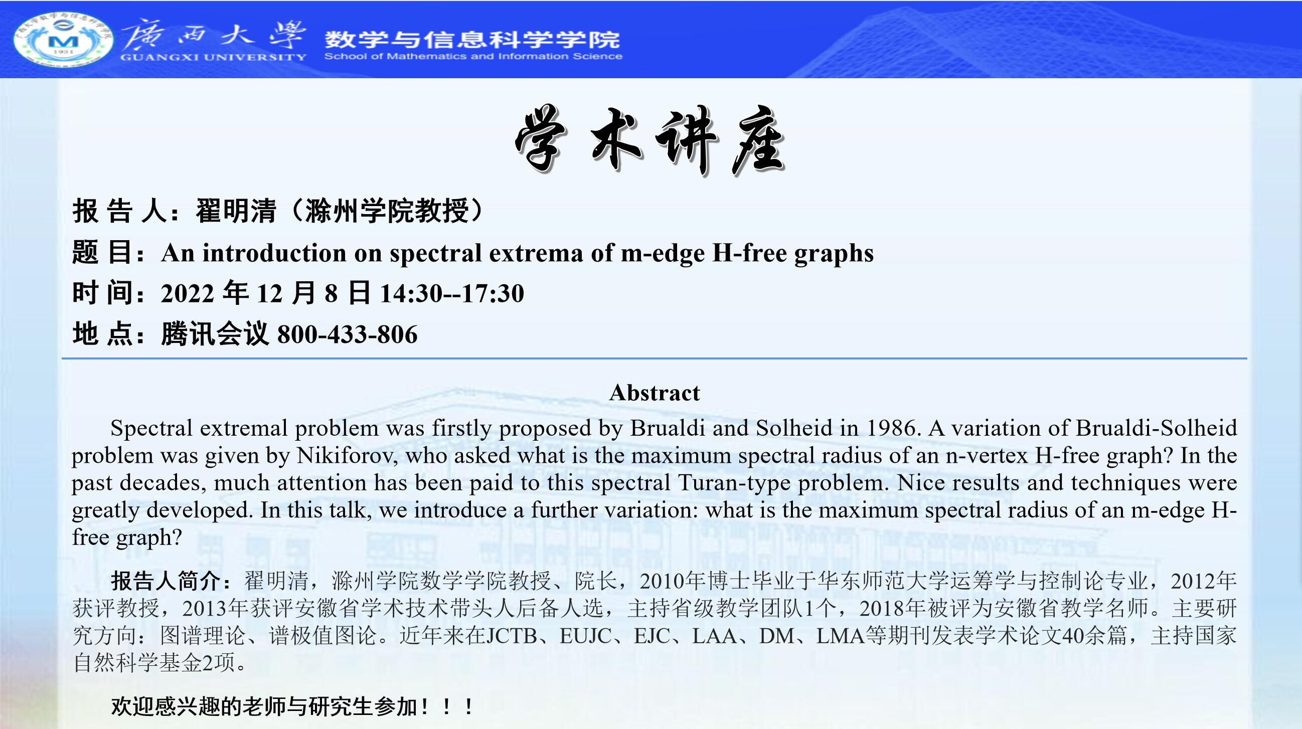 学术讲座:An introduction on spectral extrema of m-edge H-free graphs