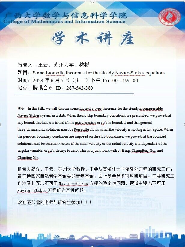 学术讲座:Some Liouville theorems for the steady Navier-Stokes equations