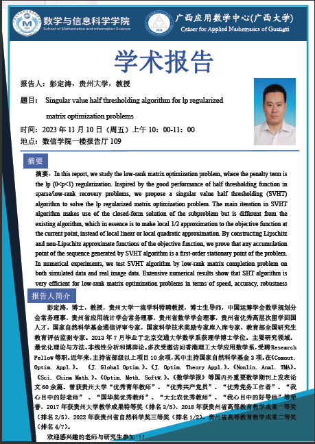 学术报告:Singular value half thresholding algorithm for lp regularized