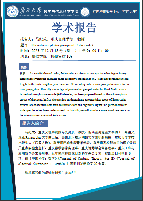 学术报告:On automorphism groups of Polar codes