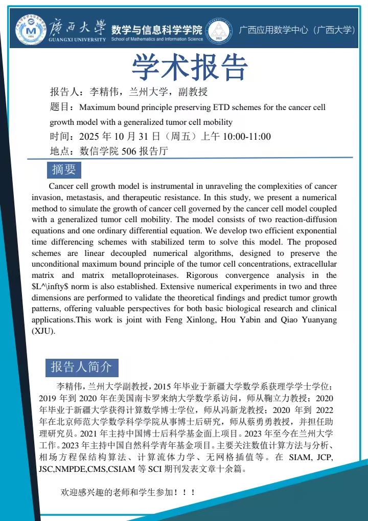 学术报告:Maximum bound principle preserving ETD schemes for the cancer cell growth model with a generalized tumor cell mobility