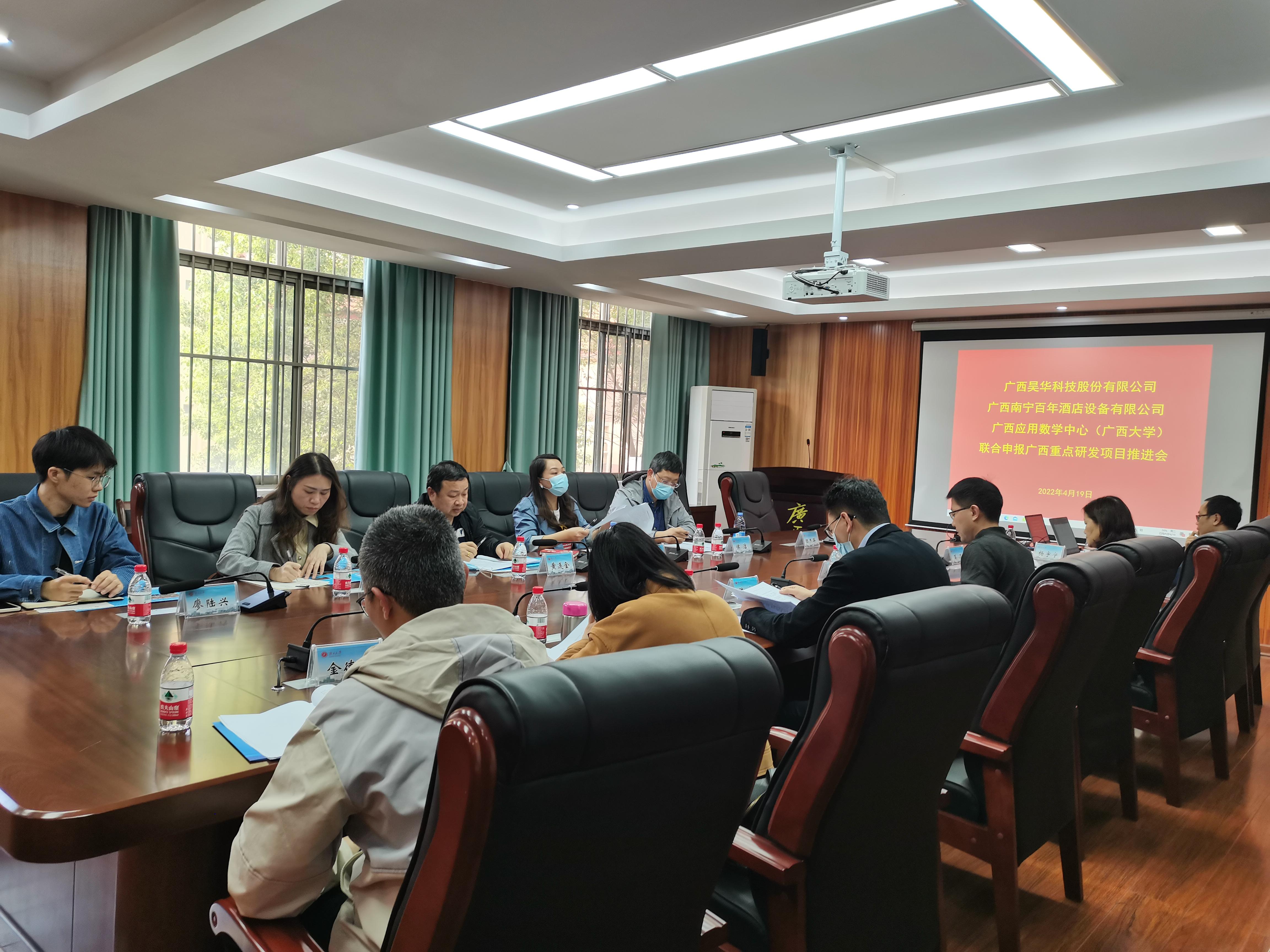 2022年4月19日,广西昊华科技股份有限公司、广西南宁百年酒店设备有限公司和广西应用数学中心(英国威廉集团官网)在英国威廉集团官网英国威廉集团官网召开联合申报广西重点研发项目推进会。广西南宁百年酒店设备有限公司总经理黄连金、副总经理侯洁,广西优耐信息技术有限公司项目申报部经理梁晶,广西应用数学中心(英国威廉集团官网)常务副主任、英国威廉集团官网英国威廉集团官网副经理袁功林,广西应用数学中心(英国威廉集团官网)团队负责人等参加了此次会议。