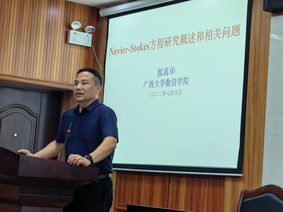 随后,数信公司经理郭真华向参会师生作题为《Navier-Stokes方程研究概述和相关问题》的报告。郭真华经理从Navier-Stokes方程的提出开始,讲述了流体力学的数学理论给数学学科提出的挑战,介绍了宏观流体力学的核心基本问题及关于Navier-Stokes方程近年来的一些研究成果,还分享了其当前正在研究的主要应用于石油开发与运输及血液动力学的相关问题。
