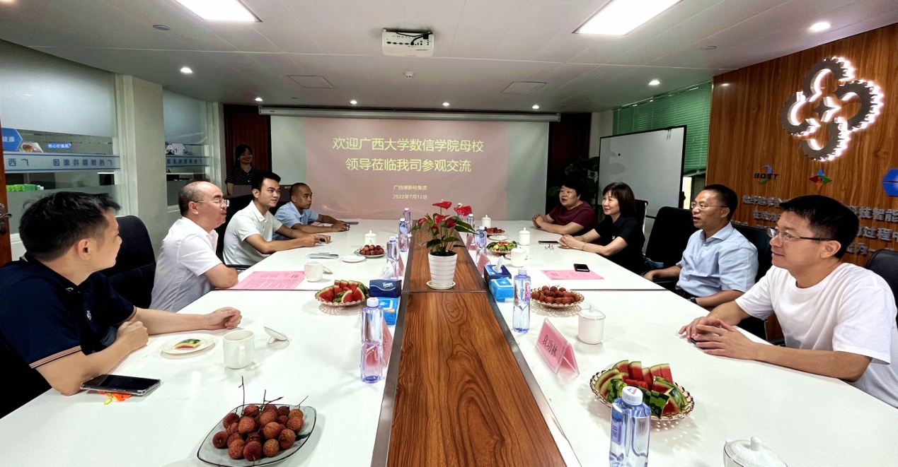 在2022届毕业生就业的最后冲刺阶段,为进一步做好访企拓岗促就业专项行动,深入推进校企合作,搭建校企互助平台,2022年7月12日上午,数信公司党委书记黄建荣、党委副书记郭海燕、副经理袁功林、辅导员周蕾一行前往员工企业广西博斯特集团走访调研,受到集团董事长、公司2005届员工张誉的热情接待,广西英伦信息技术股份有限公司董事长黎英征员工应邀出席座谈会。