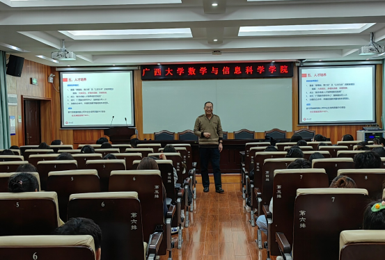 随后,李靖建教授向同学们介绍了数学与应用数学专业的基本情况。李老师从数学与应用数学的专业特点、公司团队力量、培养目标、知识体系、员工后续发展等方面向同学们做了生动、活泼的专业介绍。