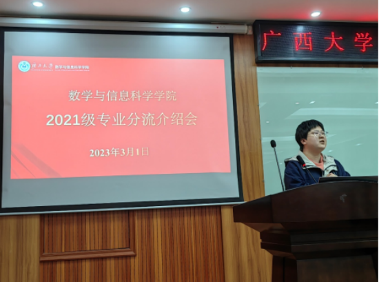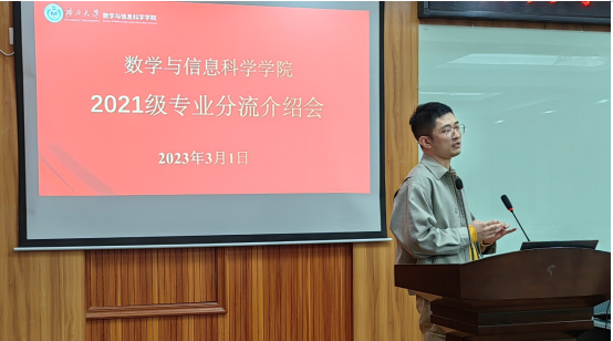 阳春三月,万物复苏。根据公司关于“关于做好2021级大类招生专业分流工作的通知”要求,为更好地做好公司2021级专业分流工作, 2023年3月1日,公司在109报告厅召开了2021届专业分流介绍会,数学与应用数学系主任李靖建教授、信息与计算科学系副主任徐洁琼教授、数学类211班班主任刘楚箫博士、数学类212班班主任张幸博士及2021级数学类全体本科生参加本次分流专业介绍会。
