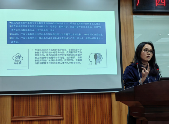 首先,徐洁琼教授向同学们介绍了信息与计算科学专业的基本情况,含专业培养目标、课程设置、就业方向、团队力量等,徐老师结合自己的工作经历深入浅出地向同学们介绍了信息与计算科学专业。
