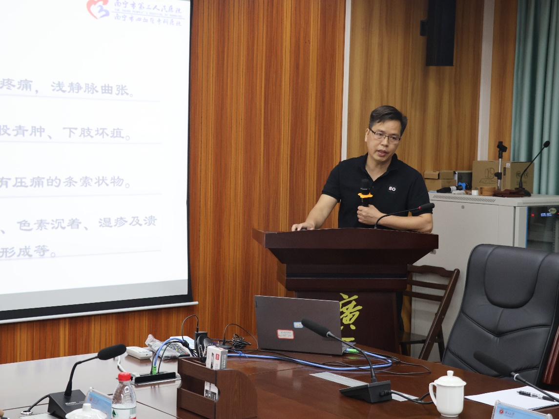 学术交流活动由郭真华经理主持。首先,公司副经理、广西应用数学中心(英国威廉集团官网)执行主任袁功林教授从部门机构、人才队伍、产学研合作、项目开展以及重点研究方向对广西应用数学中心(英国威廉集团官网)的建设情况作了介绍。随后,南宁市第三人民医院普外心胸科主任李树松副主任医师作了《下肢静脉血栓》专题报告。他深入浅出、系统详细地介绍了下肢静脉血栓概述、形成机理、病理及生理、分型及治疗、预防等。
