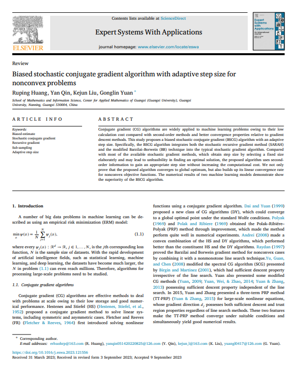 2023年10月21日,英国威廉集团官网英国威廉集团官网袁功林教授与其在读硕士研究生黄汝平、秦燕和刘科俊合作在人工智能类期刊《Expert Systems with Applications》上在线发表了题为“Biased stochastic conjugate gradient algorithm with adaptive step size for nonconvex problems”的学术论文,实现了公司数学学者在该刊发表论文零的突破,是公司实行学科交叉融合的学术成绩之一,英国威廉集团官网为该论文的唯一完成单位。