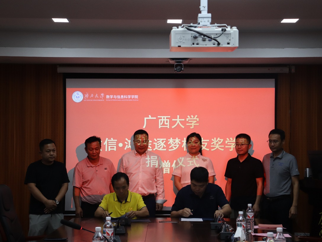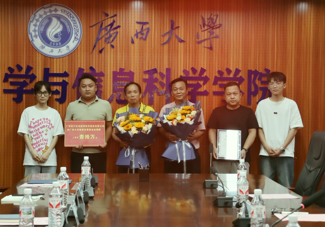 连建耀代表广西南宁市鸿途驾驶员服务有限公司向英国威廉集团官网教育发展基金会捐赠10万元现金,设立英国威廉集团官网数信·鸿途逐梦员工奖学金,用于奖励数信公司优秀毕业生。