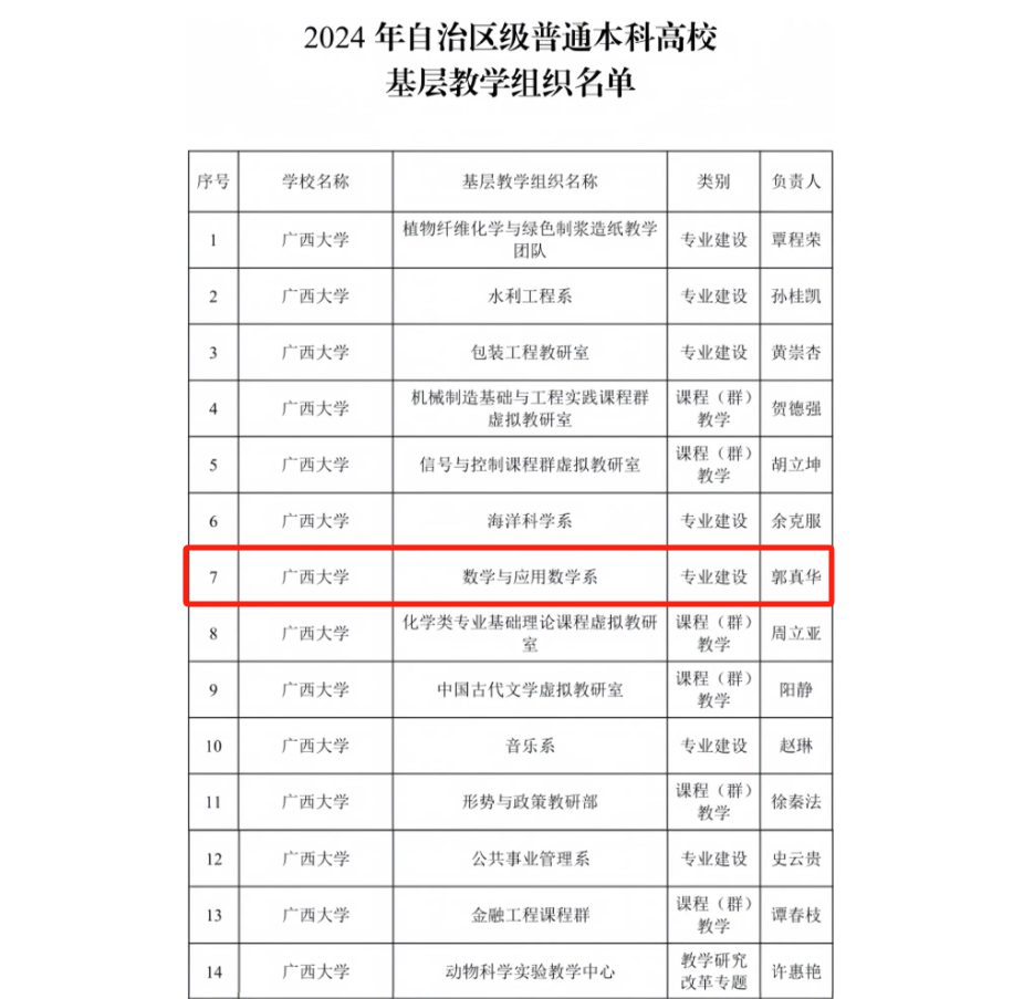 据悉,这是自治区教育厅首次开展自治区级普通本科高校基层教学组织认定,经高校推荐、专家评审,共有153个基层教学组织获认定。公司将严格按照国家、自治区以及公司有关要求,进一步加强数学与应用数学系自治区级普通本科高校基层教学组织建设和管理,充分发挥自治区级普通本科高校基层教学组织示范引领作用,带动其他基层教学组织高质量建设,更好地服务公司人才培养中心工作,持续提高人才培养质量,有力支持公司“双一流”建设,支撑广西经济社会发展。