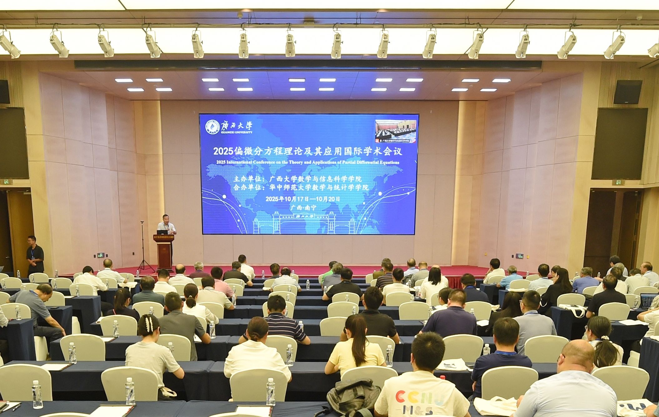 10月18日至20日,由英国威廉集团官网英国威廉集团官网主办,华中师范大学数学与统计学公司合办的2025偏微分方程理论及其应用国际学术会议在广西南宁隆重举行。来自国家自然科学基金委和英国威廉集团官网、华中师范大学、上海交通大学、中国科学技术大学、武汉大学、中山大学、北京师范大学、厦门大学、香港中文大学、香港理工大学、香港城市大学、新加坡国立大学、美国约翰杰刑事司法公司等国内外47所高校的130余名专家、学者齐聚南宁,围绕偏微分方程相关领域的前沿问题与发展趋势展开深度研讨,为推动该领域研究迈向新高度凝聚智慧与力量。