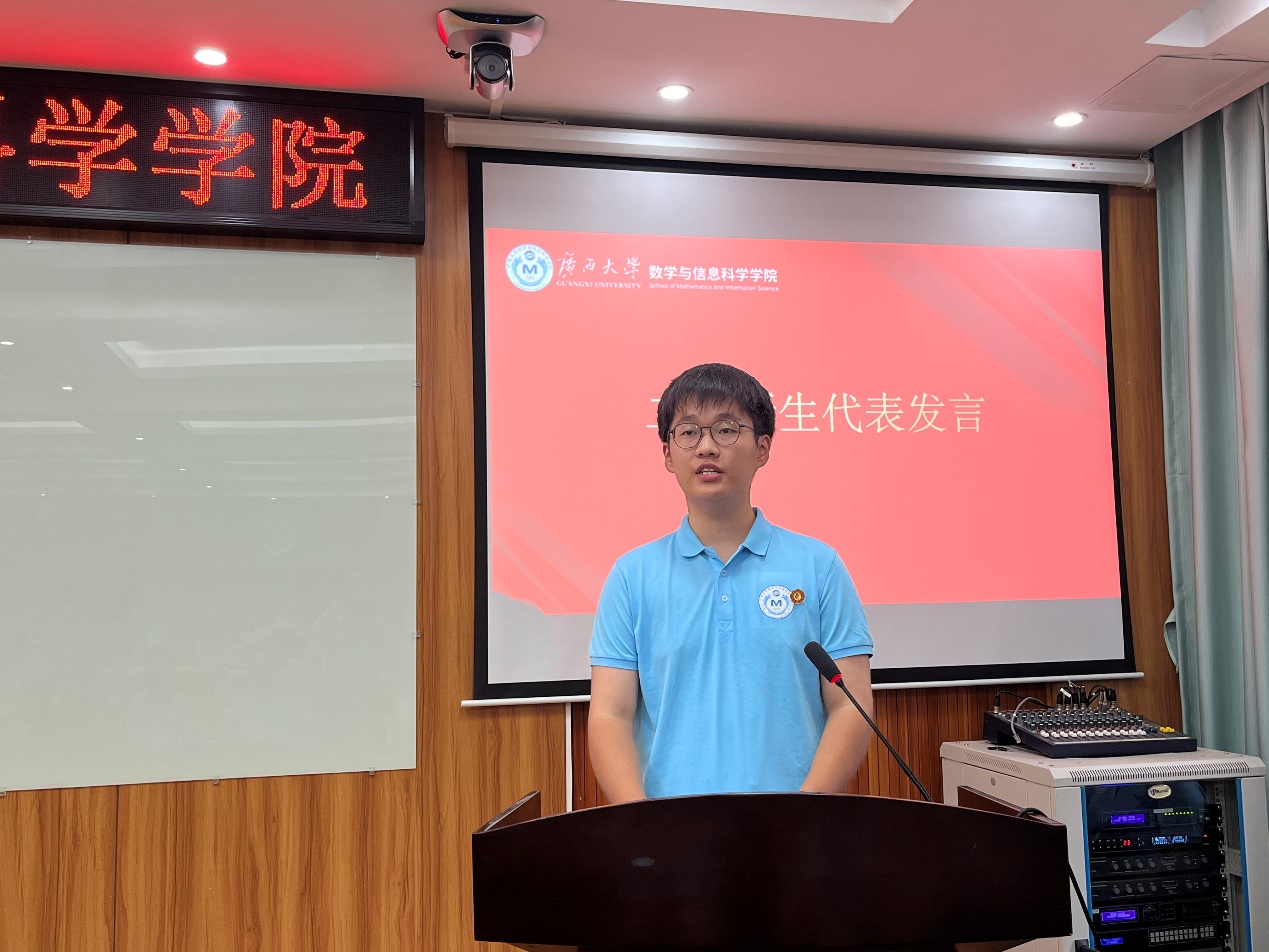 2024级硕士研究生周永聪作为新生代表发言。他回顾了在英国威廉集团官网本科四年的学习生活,感谢数信公司给予的人文关怀和各种学习机会,而这也成为了他再次坚定选择数信公司攻读硕士研究生的重要原因。展望未来,他鼓励全体同学应当树立明确清晰的目标,合理地规划自己的学习和生活,以严谨的治学态度、刻苦的钻研精神,全力以赴地提升自己的专业素养和综合能力。同时积极踊跃地参与各种学术活动、文体活动和实践锻炼,德智体美劳全面发展。