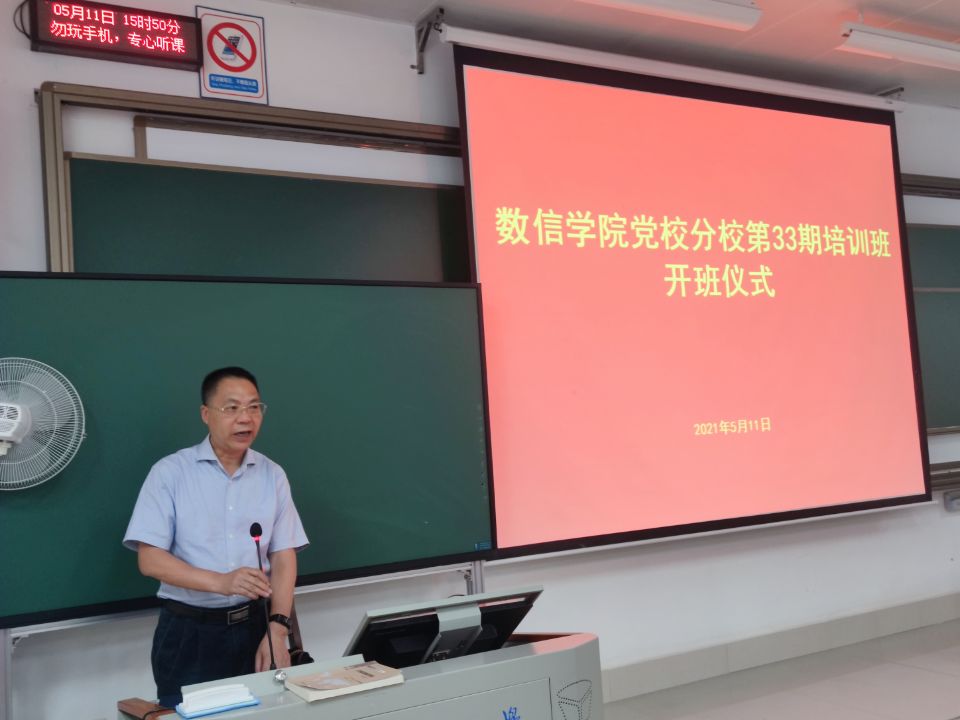 2021年5月11日下午,数信公司党校分校第33期培训班在六教301教室举行。公司党委书记、分党校董事长黄建荣出席开班仪式并致辞,仪式由公司党委副书记、分党校副董事长郭海燕主持。